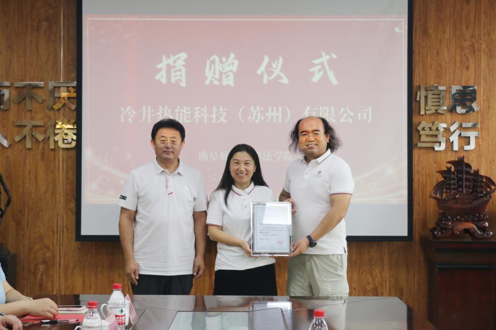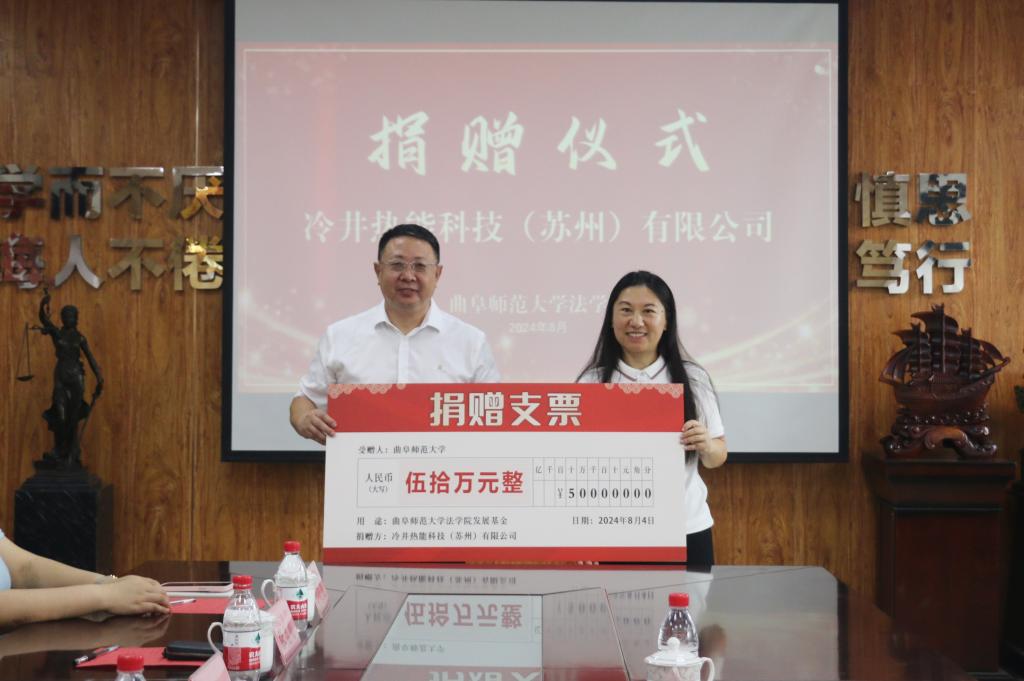法学院 国内合作处讯 8月6日上午,大发平台法学院举办校友捐赠仪式,校友企业冷井热能科技(苏州)有限公司向曲阜师大孔子教育基金会捐赠50万元,用于支持学校法学教育事业。曲阜师大1999级经济法政学院校友、冷井热能科技(苏州)有限公司董事长贺妮、总经理杨家,大发平台党委常委、副校长、大发平台孔子教育基金会理事长纪洪涛出席签约仪式。