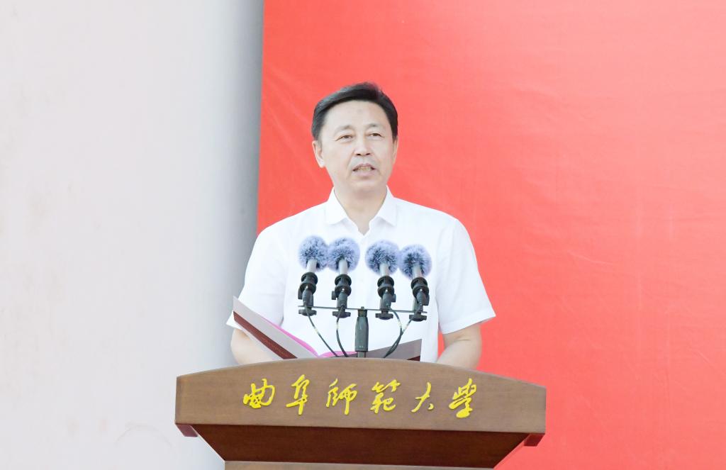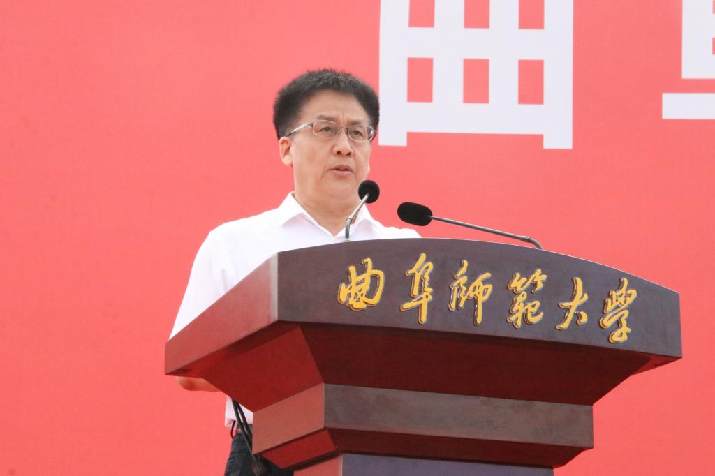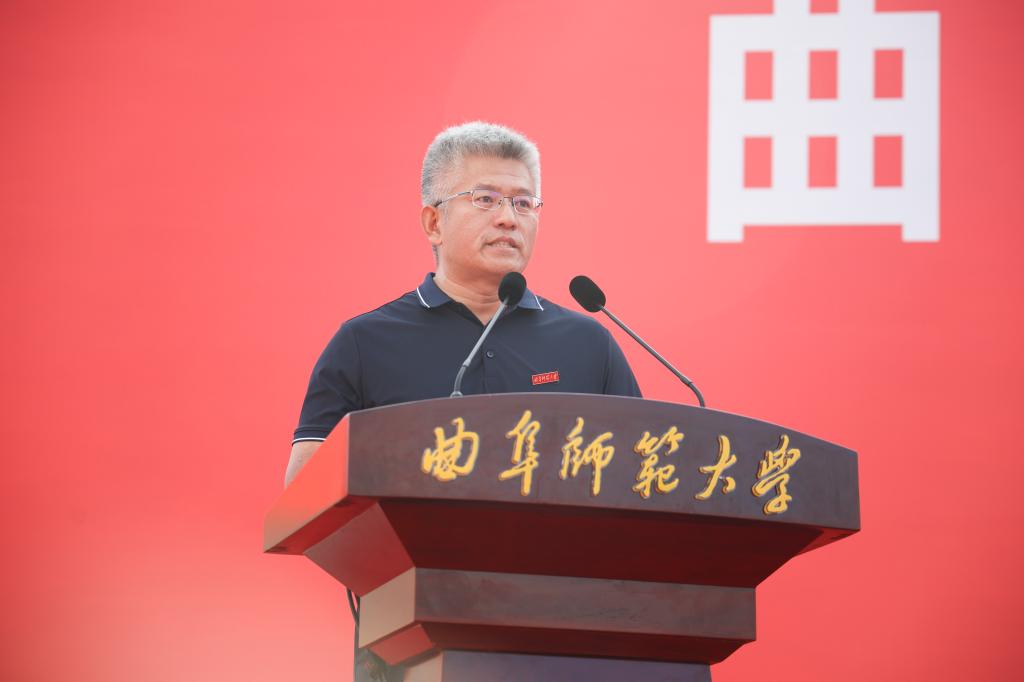典礼在庄严的升旗仪式中拉开序幕。典礼上,党委副书记、校长张洪海为新生代表佩戴校徽并讲话,寄语新生挺膺担当,奋力书写青春篇章。党委副书记李志红,党委常委、副校长胡凡刚分别在曲阜、日照校区主持典礼。