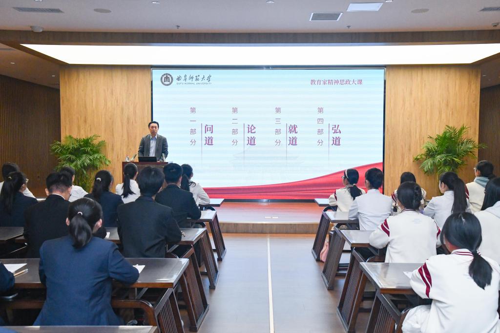 “作为孔子家乡大学的学生,应该具备怎样的卓越?为了达到不一样的卓越,应该进行怎样的拼搏?”张洪海提出曲阜师大“校长之问”,以“校长之问”涵养“躬耕教坛、强国有我”之志,启迪同学们要勤学笃行、心系家国。张洪海现场给同学们留下了要认真思索的问题,并勉励大家要树立远大的理想抱负,把个人理想融入强国建设和民族复兴的时代洪流之中;要涵养高尚的道德情操,用自己的言行传递向善向上正能量;要投身火热的青春实践,在学思践悟中奋进新征程、展现新气象。张洪海强调,师范学子作为未来的人民教师,终将站上讲台,肩负起培养社会主义建设者和接班人的重要任务,更要深刻理解和践行教育家精神。