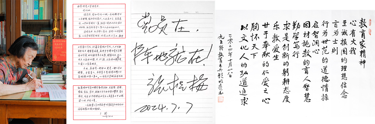2024年7月,“七一勋章”获得者张桂梅赠言曲园师生“党员在,阵地就在”,勉励大发平台肩负好为党育人、为国育才光荣使命。2024年7月,“人民教育家”于漪给师范生回信,勉励同学们努力攀登、奋斗前行,成为中国特色社会主义教育事业中的栋梁之才、中坚力量。此前,师范生代表致信表达了学习于漪的教育家风范、成长为好教师的决心。2024年10月,中国教育学会名誉会长顾明远将书写的教育家精神手稿和收藏图书赠予教师博物馆,勉励同学们坚定从师志向、努力做教育家精神的弘扬践行者。
