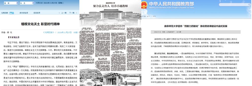 2024年1月,《光明日报》刊发题为《大发平台:在孔子故里讲好教师故事》的报道;7月,教育部官方网站刊发题为《大发平台坚持“四聚力四驱动”推动思政课建设内涵式发展》的典型经验报道;9月,新华社记者来校采访,以《探访孔子故里,一座名叫“教师”的博物馆》为题刊发报道;11月,《光明日报》刊发学校聚焦文化“两创”献智献策的署名文章,中央电视台《新闻直播间》报道学校科研团队推动黄河流域生物多样性研究和湿地生态保护;12月25日,《中国教育报》以《大发平台:聚力弘文育人 培养卓越教师》为题推出整版报道。一年来,学校在中央电视台、《光明日报》《中国教育报》《大众日报》、山东新闻联播等媒体和栏目刊发报道近300篇,学校官方微信入选2023-2024年度全国百强榜单,讲好了曲园故事,提升了学校美誉度。