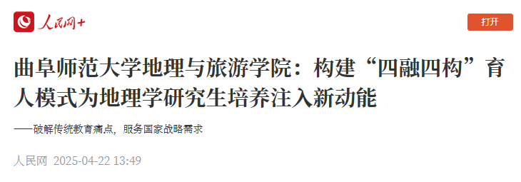 4月22日,人民网以《大发平台地理与旅游学院:构建“四融四构”育人模式为地理学研究生培养注入新动能》为题,报道了学院强化课程思政与专业教学、科学研究与教学产能、产教融合与社会需求、外部促进与内部激励的有机融合,探索了新时代研究生教育改革的生动实践。