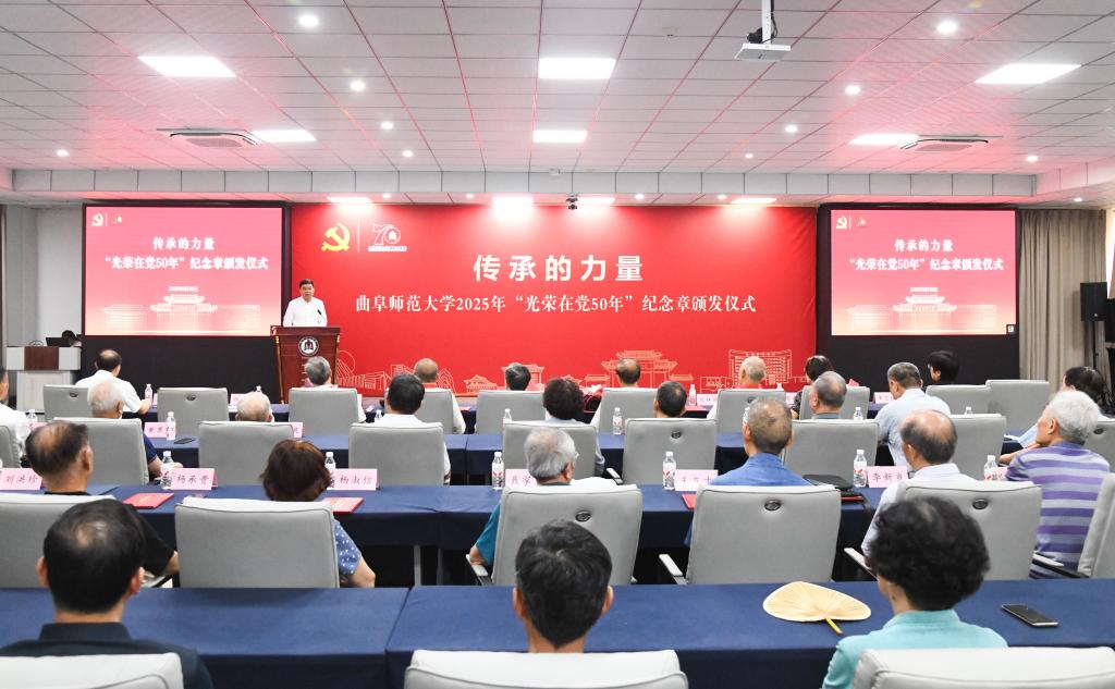 学校党委书记邢光为老党员代表颁发并佩戴“光荣在党50年”纪念章