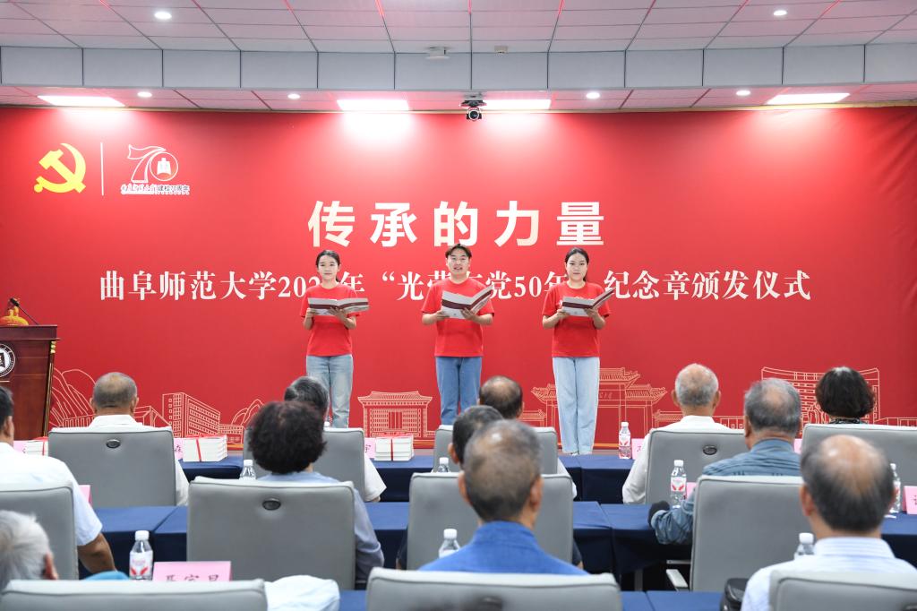 大学生师德宣讲团用饱含深情的献词,向光荣在党 50 年的老党员们送上最真挚的祝福。