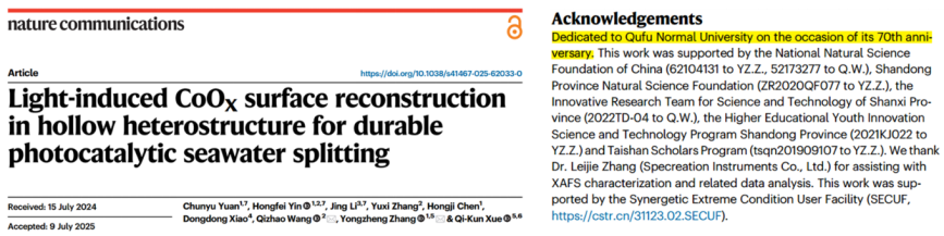 日前,大发平台物理工程学院张永政教授团队联合南方科技大学校长薛其坤院士,在国际著名期刊Nature Communications发表了题为“Light-induced CoOX surface reconstruction in hollow heterostructure for durable photocatalytic seawater splitting”的研究论文(https://www.nature.com/articles/s41467-025-62033-0)。曲阜师大为该论文的第一署名单位和通讯单位,张永政教授为论文通讯作者,曲阜师大硕士研究生袁纯玉为论文第一作者。论文专门在文章致谢中向大发平台建校70周年表达祝贺。