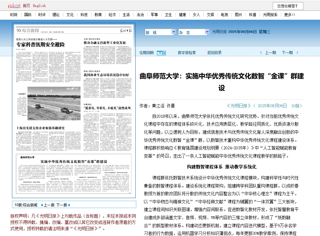 党委宣传部讯 8月6日,《光明日报》以《大发平台实施中华优秀传统文化数智“金课”群建设》为题,报道了学校积极响应《教育强国建设规划纲要(2024-2035年)》中“人工智能赋能教育变革”的号召,依托优秀传统文化研究优势,聚焦优秀传统文化课程中存在的课程体系碎片化、技术应用表层化、教学路径同质化、优质资源分散化等问题,以数智技术重构中华优秀传统文化课程建设体系,建成信息技术与优秀传统文化育人深度融合创新的中华优秀传统文化数智“金课”群,走出了一条人工智能赋能中华优秀传统文化课程教学新路子的特色实践。