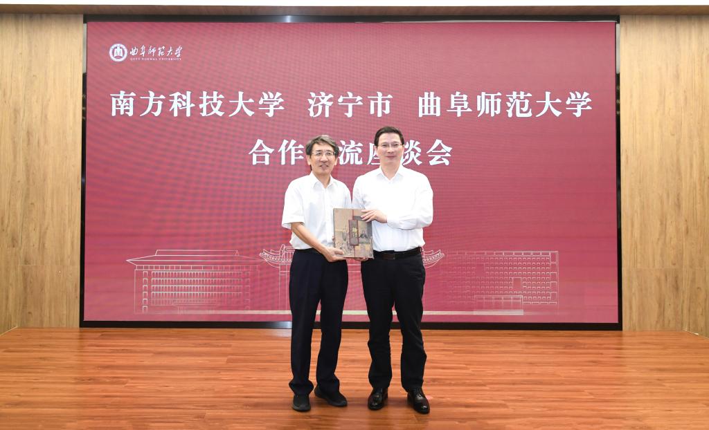 会上,温金荣、张洪海分别向薛其坤校长赠送了纪念物,薛其坤校长向济宁市和曲阜师大赠送了南方科技大学纪念盘。