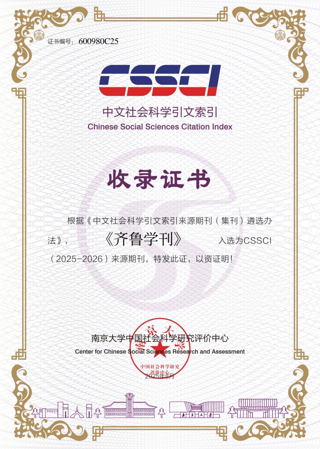 《齐鲁学刊》编辑部讯 日前,曲阜师大《齐鲁学刊》收到南京大学中国社会科学研究评价中心的收录证书,根据《中文社会科学引文索引来源期刊(集刊)遴选办法》,《齐鲁学刊》继续入选为CSSCI(2025—2026)来源期刊。