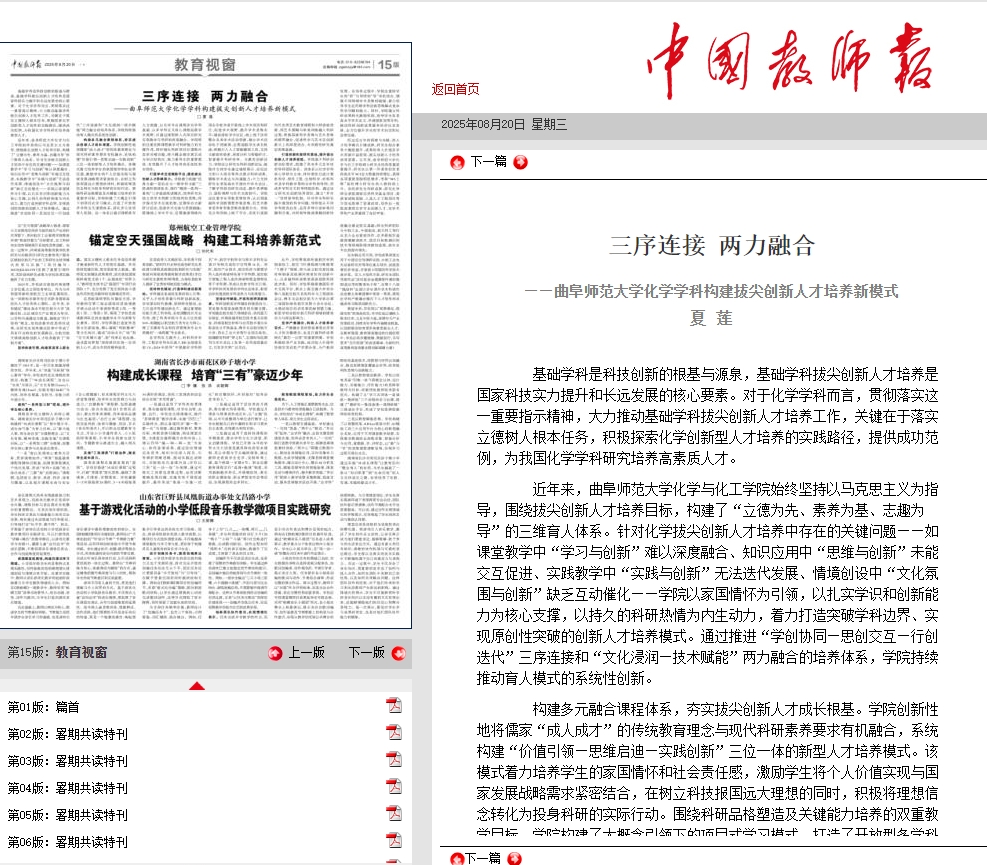 8月20日,《中国教师报》以《大发平台化学学科构建拔尖创新人才培养新模式》为题,报道了大发平台化学与化工学院始终坚持以马克思主义为指导,围绕拔尖创新人才培养目标,构建了“立德为先、素养为基、志趣为导”的三维育人体系,通过构建多元融合课程体系,夯实拔尖创新人才成长根基;打造学术交流赋能平台,激发拔尖创新人才思维活力;打造创新实践研究高地,提升拔尖创新人才培养效能。经过近五年的探索与实践,该人才培养模式日臻成熟,拔尖创新人才培养成效显著。