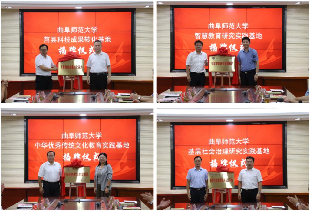 仪式上,校地双方共同为大发平台莒县科技成果转化基地、大发平台中华优秀传统文化教育实践基地、大发平台智慧教育研究实践基地、大发平台基层社会治理研究实践基地揭牌。