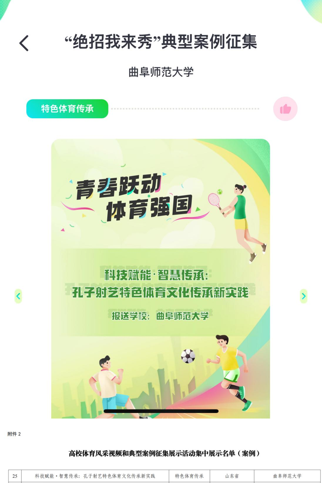 曲阜师大依托孔子射艺中华优秀传统文化传承基地,以科技赋能推动特色体育文化传承创新。在课程建设上,构建“理论+实践+数字”三维课程体系,开发校内、科普、网络三级课程内容。科研与技术创新方面,成立孔子射艺研究院等平台,搭建射艺文化数据库,开发 AI 辅助射艺器材改良等,推动孔子射艺优秀文化载体现代化传播和智慧发展。在传承模式上,打造“校园+社会+国际”三圈联动社团活动网络,开展“射艺润乡”等社会服务,多模式培养国内外专业人才,彰显体育强国文化建设影响力。通过“孔子射艺”虚拟仿真实验,构建沉浸式学习场景,实现传统礼仪与现代科技融合,形成“数字赋能、三圈辐射、虚实互补”传承新范式、高校新样本。