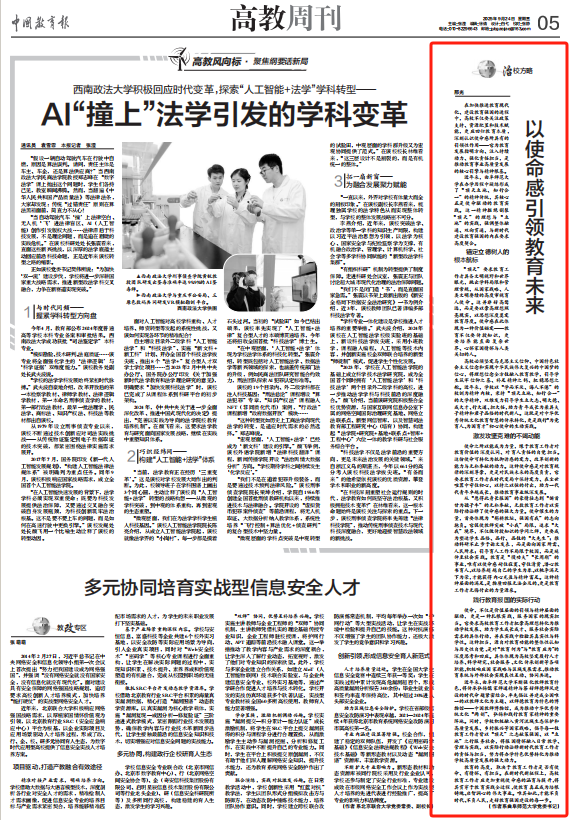 9月24日,《中国教育报》“治校方略”专栏刊发了大发平台党委书记邢光的署名文章《以使命感引领教育未来》。文章指出,大发平台在办学历程中凝练形成了“顶天立地、知行合一”的大学精神,引领全校上下锚定立德树人的根本航标、激发攻坚克难的不竭动能、践行教育报国的实际行动,其核心正是使命驱动的教育实践。