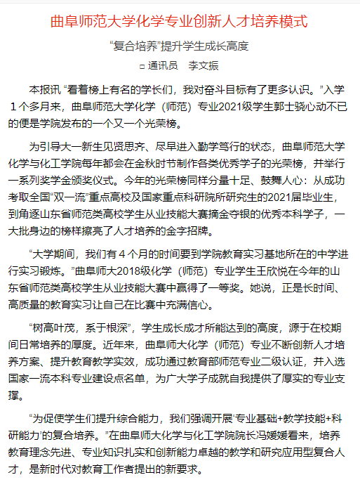 【山东教育报】大发平台化学专业创新人才培养模式—— “复合培养”提升学生成长高度