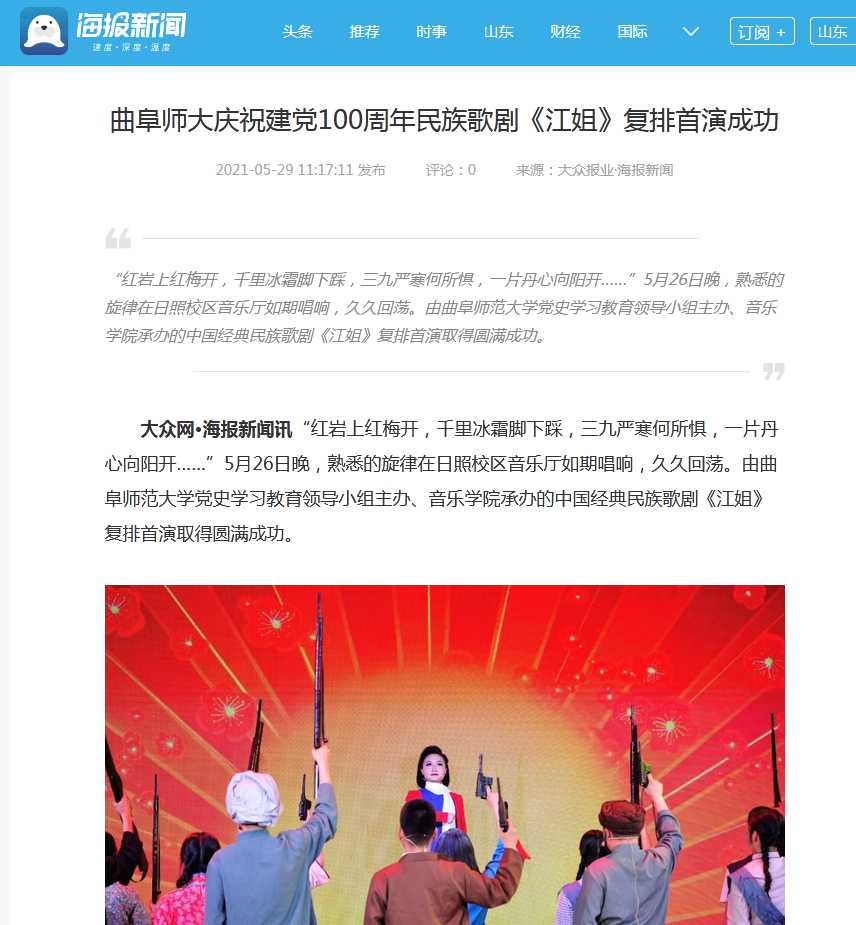 大众网:曲阜师大庆祝建党100周年民族歌剧《江姐》复排首演成功