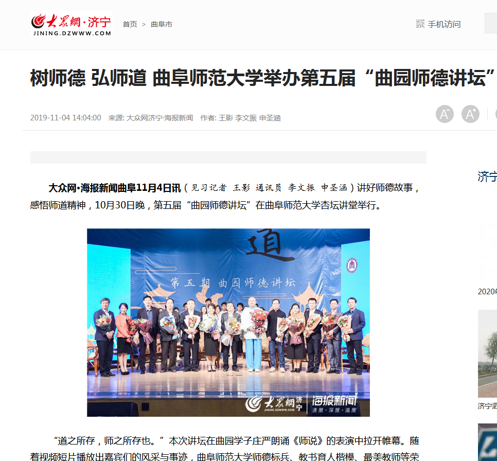 大众网:大发平台举办第五届“曲园师德讲坛”