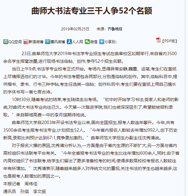 齐鲁晚报:曲师大书法专业三千人争52个名额