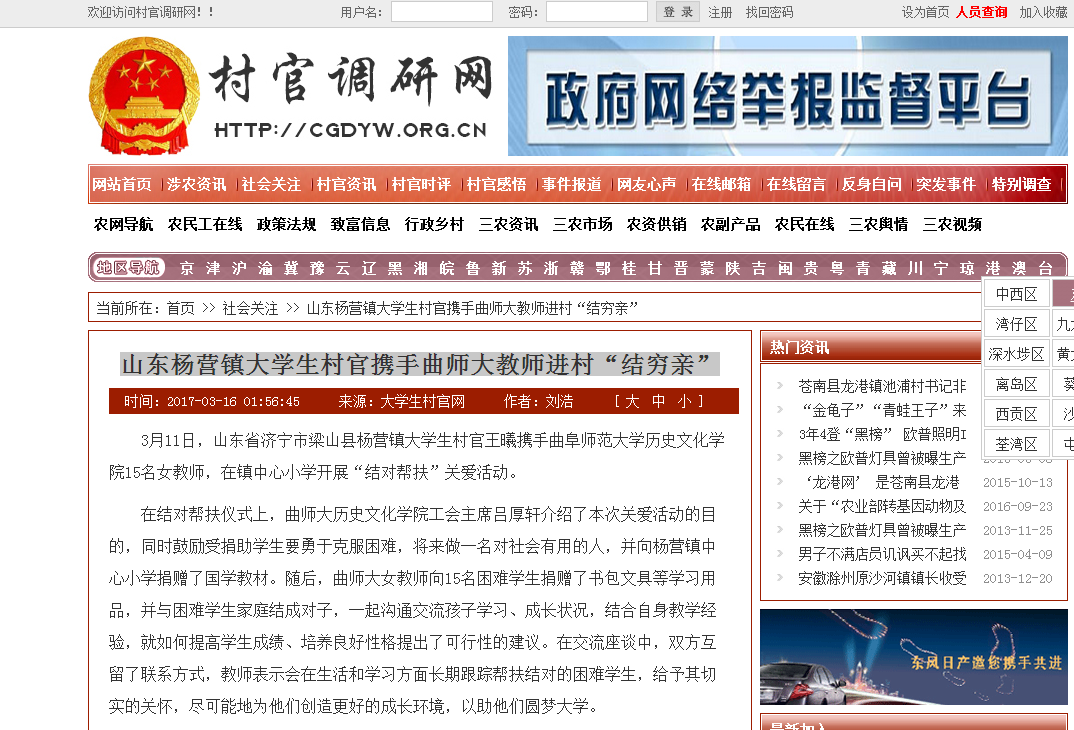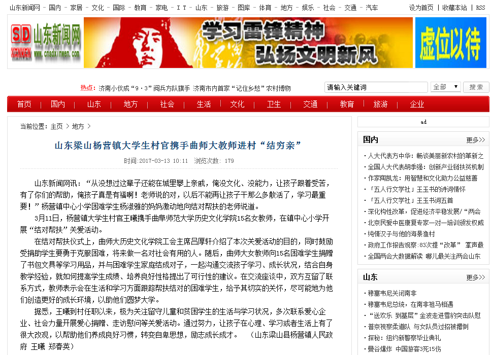 为庆祝“三八丽人节”,历史文化学院工会在院党委的领导支持下,组织全院女教工到济宁市梁山县杨营镇,给机关干部宣讲廉政文化,和杨营镇中心小学贫困家庭儿童结对爱心帮扶,度过了一个不同寻常的节日。该活动被多家媒体宣传报道,以下为部分媒体报道统计: