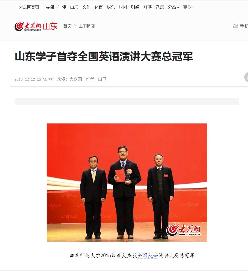 大众网:山东学子首夺全国英语演讲大赛总冠军