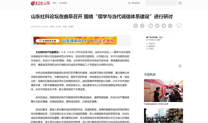 大众网:山东社科论坛在曲阜召开 围绕“儒学与当代诚信体系建设”进行研讨