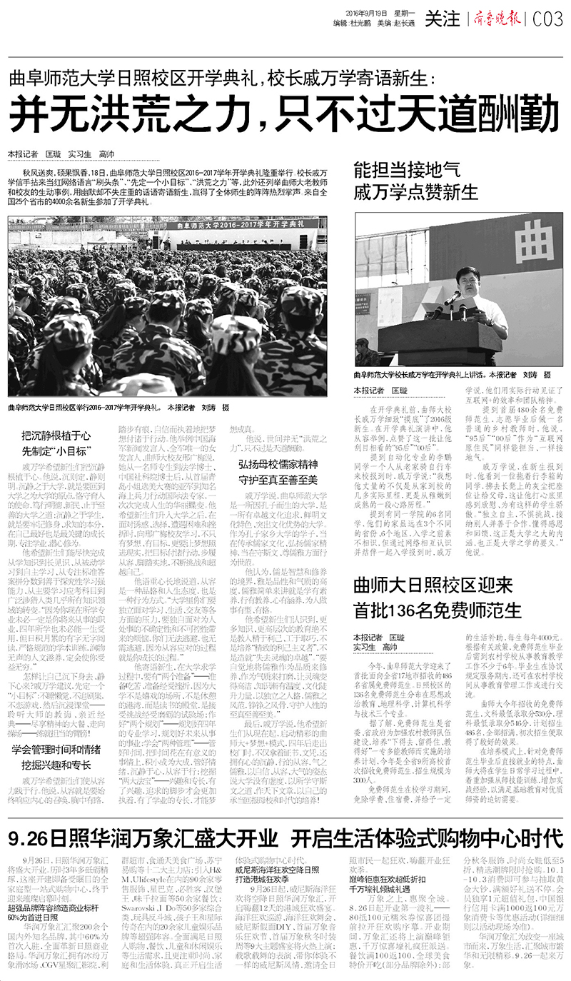 齐鲁晚报:大发平台开学典礼 校长戚万学寄语新生