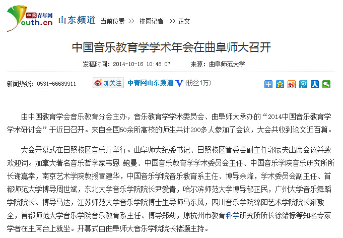 中青网:中国音乐教育学学术年会在曲阜师大召开