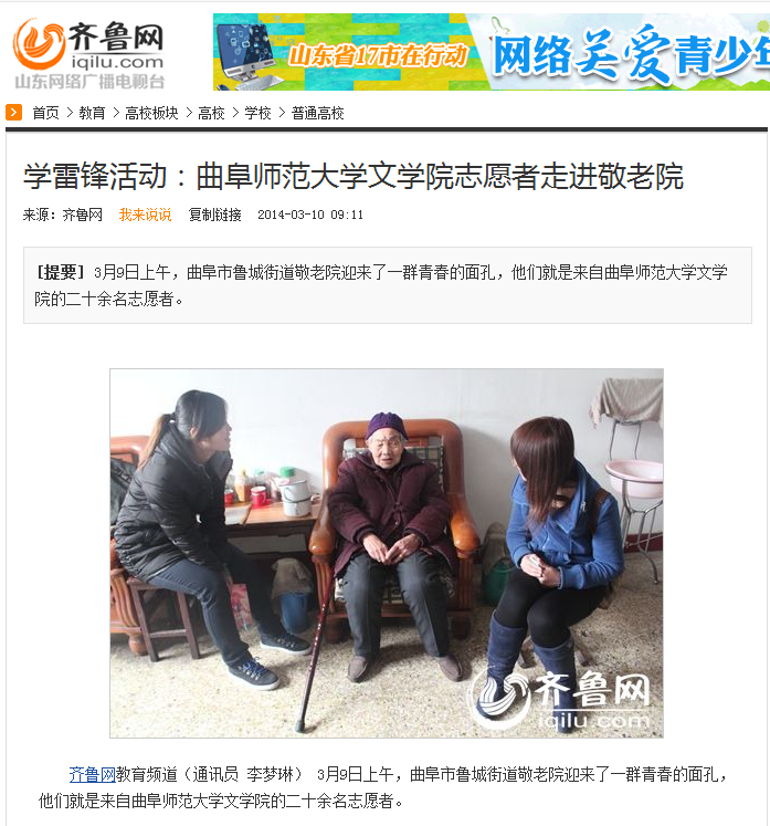 齐鲁网:学雷锋活动:大发平台文学院志愿者走进敬老院
