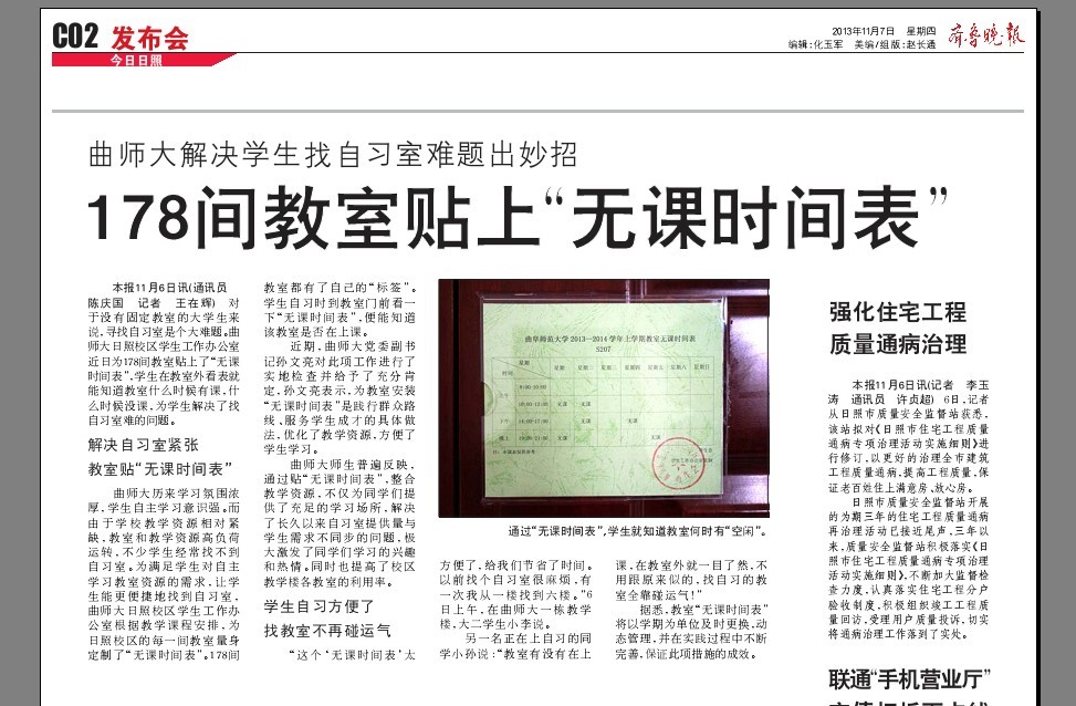 齐鲁晚报:曲师大解决学生找自习室难题出妙招