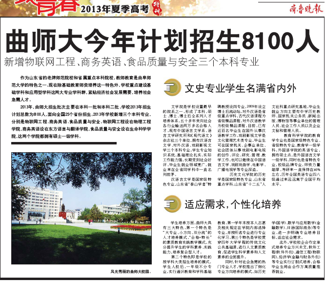6月10日,《齐鲁晚报》刊发报道《曲师大今年计划招生8100人》,介绍了我校今年的招生计划情况,并对我校的教师教育特色、部分优势特色专业和个性化的人才培养模式等进行了详细报道。 人民网、中国日报网、凤凰网、大众网等媒体进行了转发。