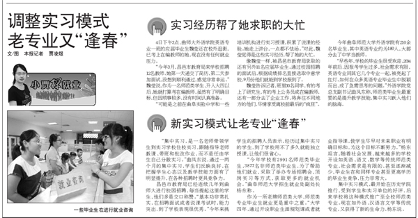 6月5日,《齐鲁晚报》刊发通讯《调整实习模式,老专业又“逢春”》,报道了我校主动适应社会需求,通过积极调整实习模式,不断提高毕业生就业竞争力,实现了传统长线专业就业质量和就业率的稳步提升,学校毕业生受到用人单位的“交口称赞”。 人民网、中国新闻网、中国经济网、中国日报网、新民网、大众网、搜狐网、重庆晨报网、天津网等十余家媒体进行了转发。