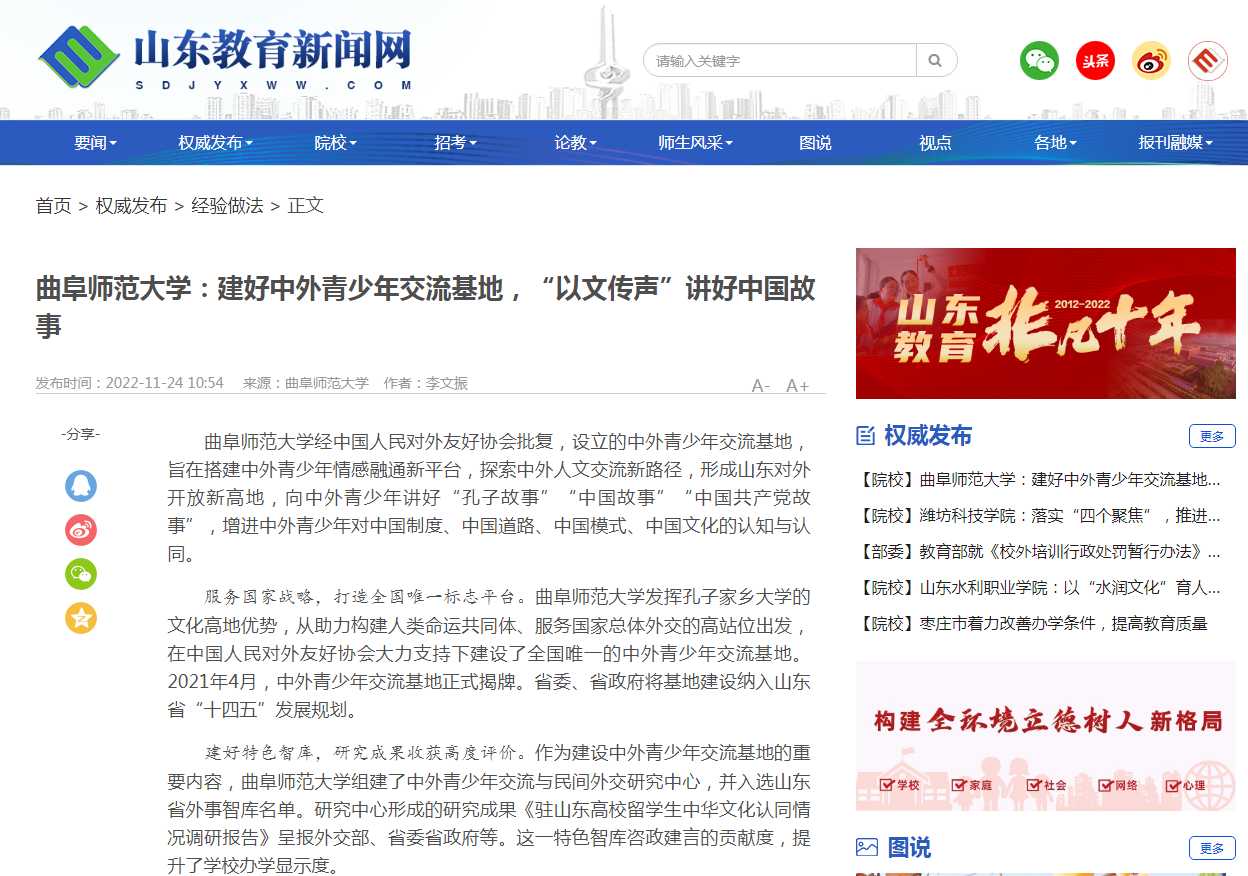 【山东教育新闻网】大发平台:建好中外青少年交流基地,“以文传声”讲好中国故事