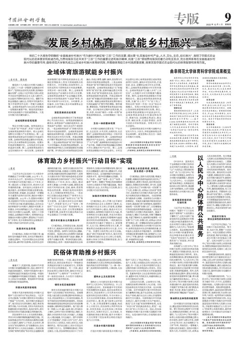 曲阜师大体育科学学院讯 日前,中国社会科学报在“发展乡村体育、赋能乡村振兴”专版中刊登了大发平台山东省乡村振兴体育研究院执行副院长曹莉教授团队的系列成果,其内容包括:体育助力乡村振兴“行动目标”、构建以人民为中心的体育公共服务、全域体育旅游赋能乡村振兴、民俗体育助推乡村振兴等主题的阶段性战略研究。报道还对学校体育科学学院近年来取得的相关成绩进行了列举,相关科研成果为全国农村体育发展提供理论依据和现实借鉴,标志着团队的研究在乡村体育领域处于省内领先地位、对全国乡村体育研究形成较大影响。