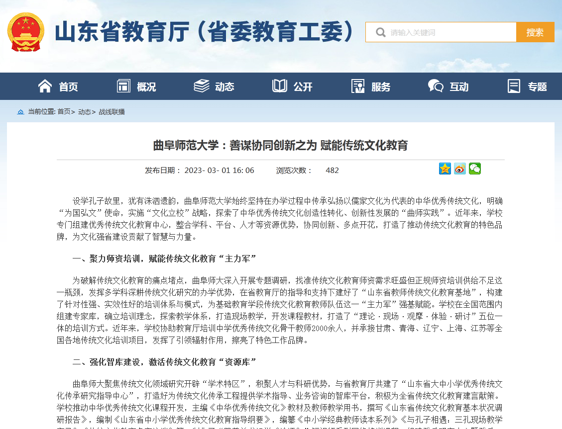 曲阜师大聚焦传统文化领域研究开辟“学术特区”,积聚人才与科研优势,与省教育厅共建了“山东省大中小学优秀传统文化传承研究指导中心”,打造好为传统文化传承工程提供学术指导、业务咨询的智库平台,积极为全省传统文化教育建言献策。学校推动中华优秀传统文化课程开发,主编《中华优秀传统文化》教材及教师教学用书,撰写《山东省传统文化教育基本状况调研报告》,编制《山东省中小学优秀传统文化教育指导纲要》,编纂《中小学经典教师读本系列》《与孔子相遇:三孔现场教学实录》《传统文化教育名家访谈》等,制作了“跟着总书记学《论语》”短视频系列网络培训课程,组建雅乐研究中心暨雅乐团,打造了孔子射艺传承基地,成立了“礼乐文化研究与推广中心”,有力丰富、激活了传统文化教育的载体与资源。