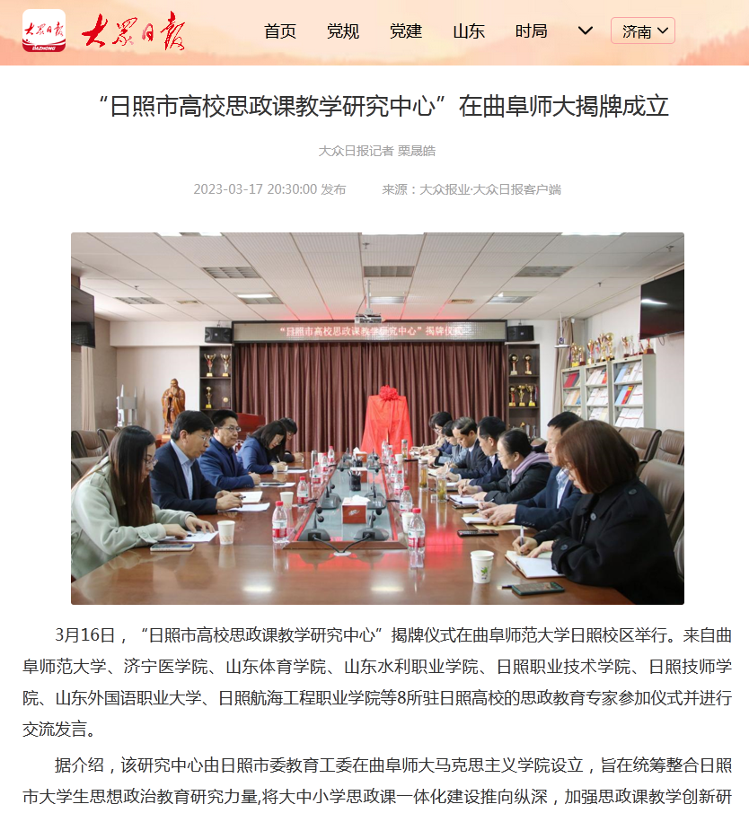 【大众日报】“日照市高校思政课教学研究中心”在曲阜师大揭牌成立