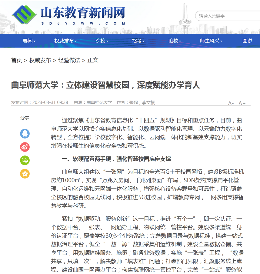 曲阜师大组建以“一张网”为目标的全光百G主干校园网络,建设B级标准机房约1000㎡,实现“万兆入房间、千兆到桌面”布局,SDN架构支撑扁平化管理、自动化运维和云网端一体化服务,增强核心设备容载量和可靠性,打造覆盖全校区的融合校园无线网,积极推进5G进校园,扩增教育专网,一网多用支撑智慧教学与科研。