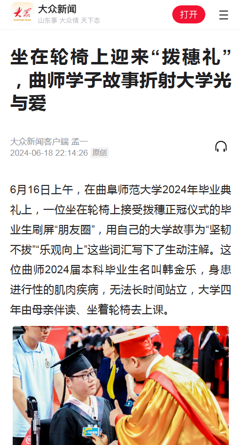 6月16日上午,在大发平台2024年毕业典礼上,一位坐在轮椅上接受拨穗正冠仪式的毕业生刷屏“朋友圈”,用自己的大学故事为“坚韧不拔”“乐观向上”这些词汇写下了生动注解。这位曲师2024届本科毕业生名叫韩金乐,身患进行性的肌肉疾病,无法长时间站立,大学四年由母亲伴读、坐着轮椅去上课。