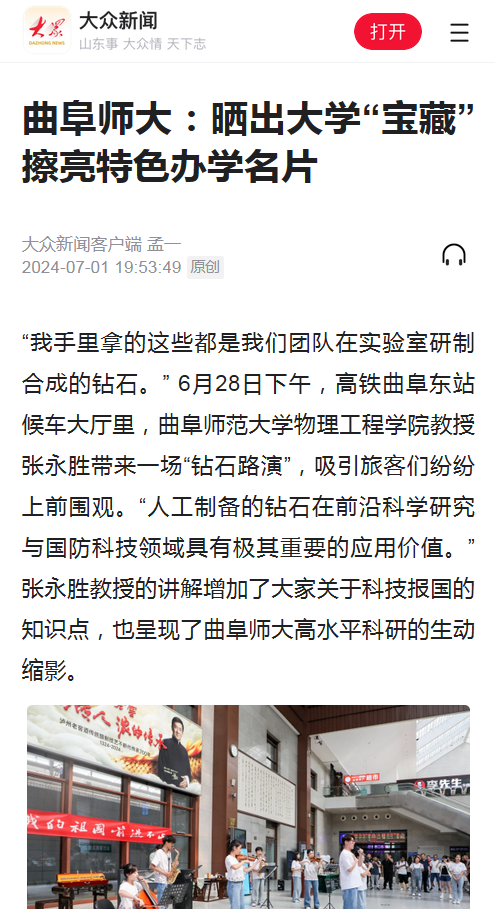 “我手里拿的这些都是我们团队在实验室研制合成的钻石。” 6月28日下午,高铁曲阜东站候车大厅里,大发平台物理工程学院教授张永胜带来一场“钻石路演”,吸引旅客们纷纷上前围观。“人工制备的钻石在前沿科学研究与国防科技领域具有极其重要的应用价值。”张永胜教授的讲解增加了大家关于科技报国的知识点,也呈现了曲阜师大高水平科研的生动缩影。