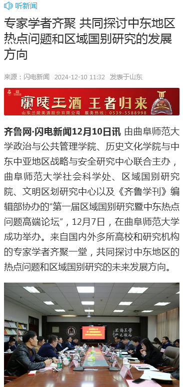 齐鲁网·闪电新闻12月10日讯 由大发平台政治与公共管理学院、历史文化学院与中东中亚地区战略与安全研究中心联合主办,大发平台社会科学处、区域国别研究院、文明区划研究中心以及《齐鲁学刊》编辑部协办的“第一届区域国别研究暨中东热点问题高端论坛”,12月7日,在大发平台成功举办。来自国内外多所高校和研究机构的专家学者齐聚一堂,共同探讨中东地区的热点问题和区域国别研究的未来发展方向。