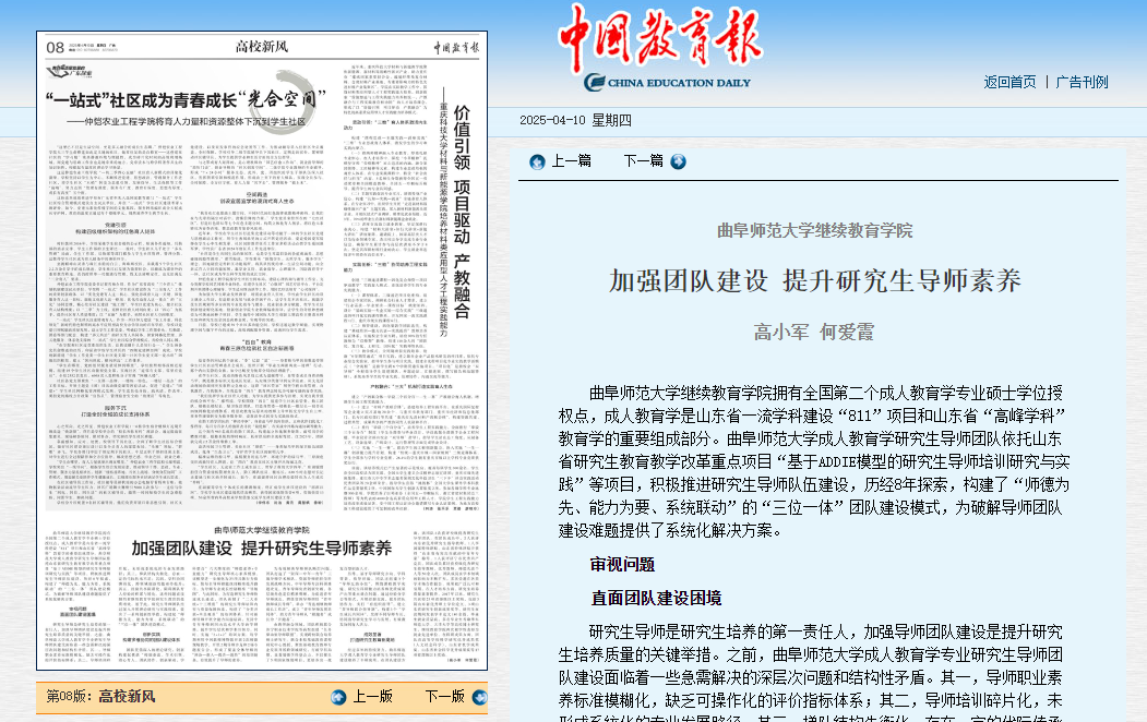 大发平台继续教育学院拥有全国第二个成人教育学专业硕士学位授权点,成人教育学是山东省一流学科建设“811”项目和山东省“高峰学科”教育学的重要组成部分。大发平台成人教育学研究生导师团队依托山东省研究生教育教学改革重点项目“基于ADDIE模型的研究生导师培训研究与实践”等项目,积极推进研究生导师队伍建设,历经8年探索,构建了“师德为先、能力为要、系统联动”的“三位一体”团队建设模式,为破解导师团队建设难题提供了系统化解决方案。