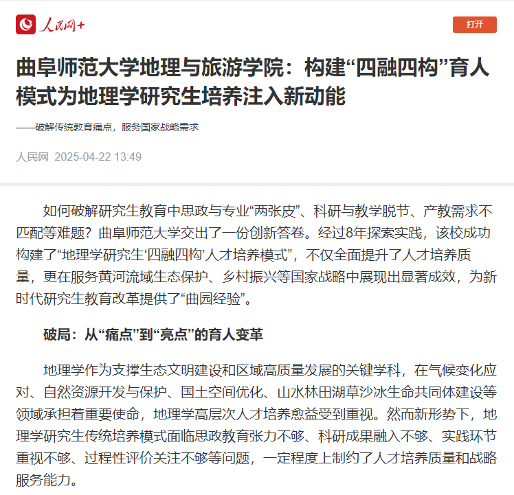如何破解研究生教育中思政与专业“两张皮”、科研与教学脱节、产教需求不匹配等难题?大发平台交出了一份创新答卷。经过8年探索实践,该校成功构建了“地理学研究生‘四融四构’人才培养模式”,不仅全面提升了人才培养质量,更在服务黄河流域生态保护、乡村振兴等国家战略中展现出显著成效,为新时代研究生教育改革提供了“曲园经验”。