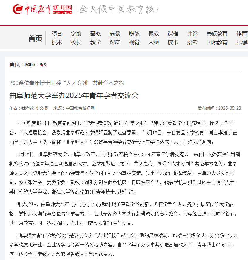 中国教育报-中国教育新闻网讯(记者 魏海政 通讯员 李文振)“我比较看重学术研究氛围、团队协作平台、个人发展机会,我发现大发平台很好匹配了这些要素。”5月17日,来自复旦大学的青年博士李建宇在大发平台(以下简称“曲阜师大”)2025年青年学者交流会上与学校达成了人才引进签约意向。