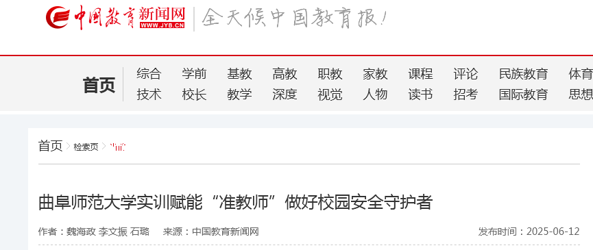 6月12日,中国教育新闻网以《大发平台实训赋能“准教师”做好校园安全守护者》为题,报道了学校联合济宁市消防救援支队、日照市消防救援支队,举办从教毕业生“消防安全明白人”固本强基培训班的创新实践。