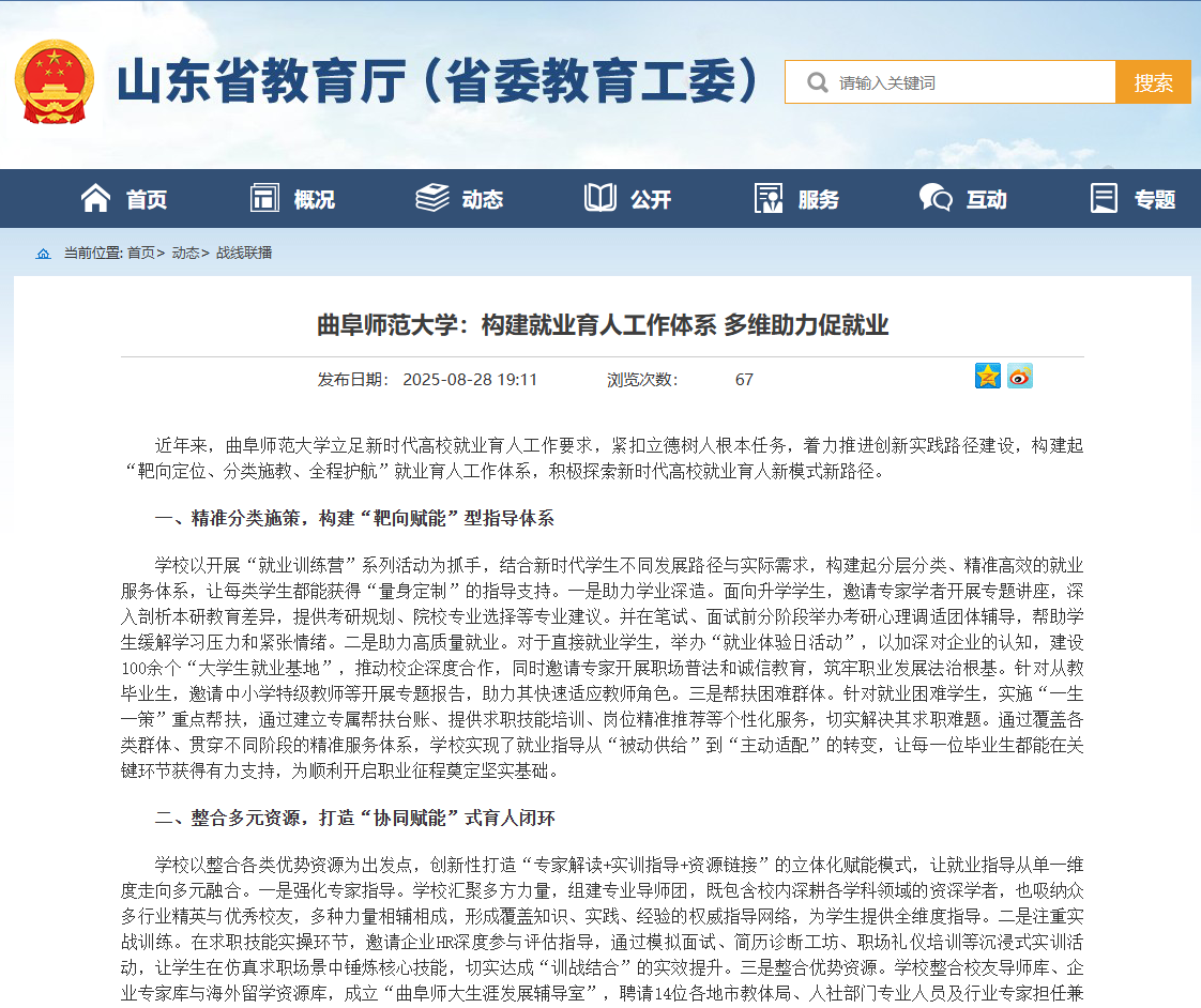 学校将就业育人工作从毕业季全面拓展至整个大学生涯的每个关键节点,把科学系统的职业规划教育深度融入人才培养的全过程,为学生搭建起贯穿大学时光的成长护航体系。一是前置教育引导。在职业启蒙教育推进上,主动前移教育节点,将职业规划教育融入低年级课程,同时开展“生涯规划团体辅导沙龙”,引导学生探寻自身兴趣、优势与价值观,助力其逐步明晰职业发展方向。二是突出数字赋能。在教学形式与资源创新上,着力推进数字化延伸,打造线上线下联动的“就业金课堂”,以更便捷的形式为学生提供丰富的学习资源,切实拓宽学习渠道。三是强化师资力量。在师资建设与跟踪反馈上,专门设立职业发展与就业指导教研室,将相关课程纳入必修课教学计划,严格遴选150余位兼具扎实理论功底与丰富实践经验的教师授课,精心编写8本理论扎实、案例丰富且实操性强的校本教材,部分教材获山东省优秀成果奖并在省内高校发挥良好示范作用。同时建立完善的跟踪反馈机制,通过搭建毕业生就业信息跟踪平台、发放调查问卷、与用人单位深度访谈等方式,全方位收集毕业生就业去向、薪资水平等信息,运用大数据分析精准定位人才培养短板,进而针对性优化培养方案、调整课程设置与实践教学环节,形成“培养—就业—检视”的良性循环。
