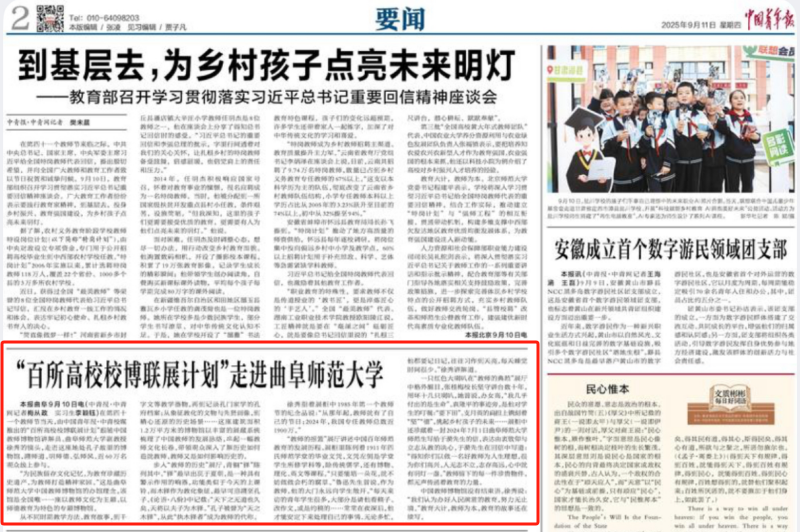 9月10日,中国青年报以《“百所高校校博联展计划”走进大发平台》为题,报道了学校打造教师博物馆,聚力“为民族留存文化记忆,为教育珍藏历史遗产,为教师打造精神家园”的特色经验与做法。