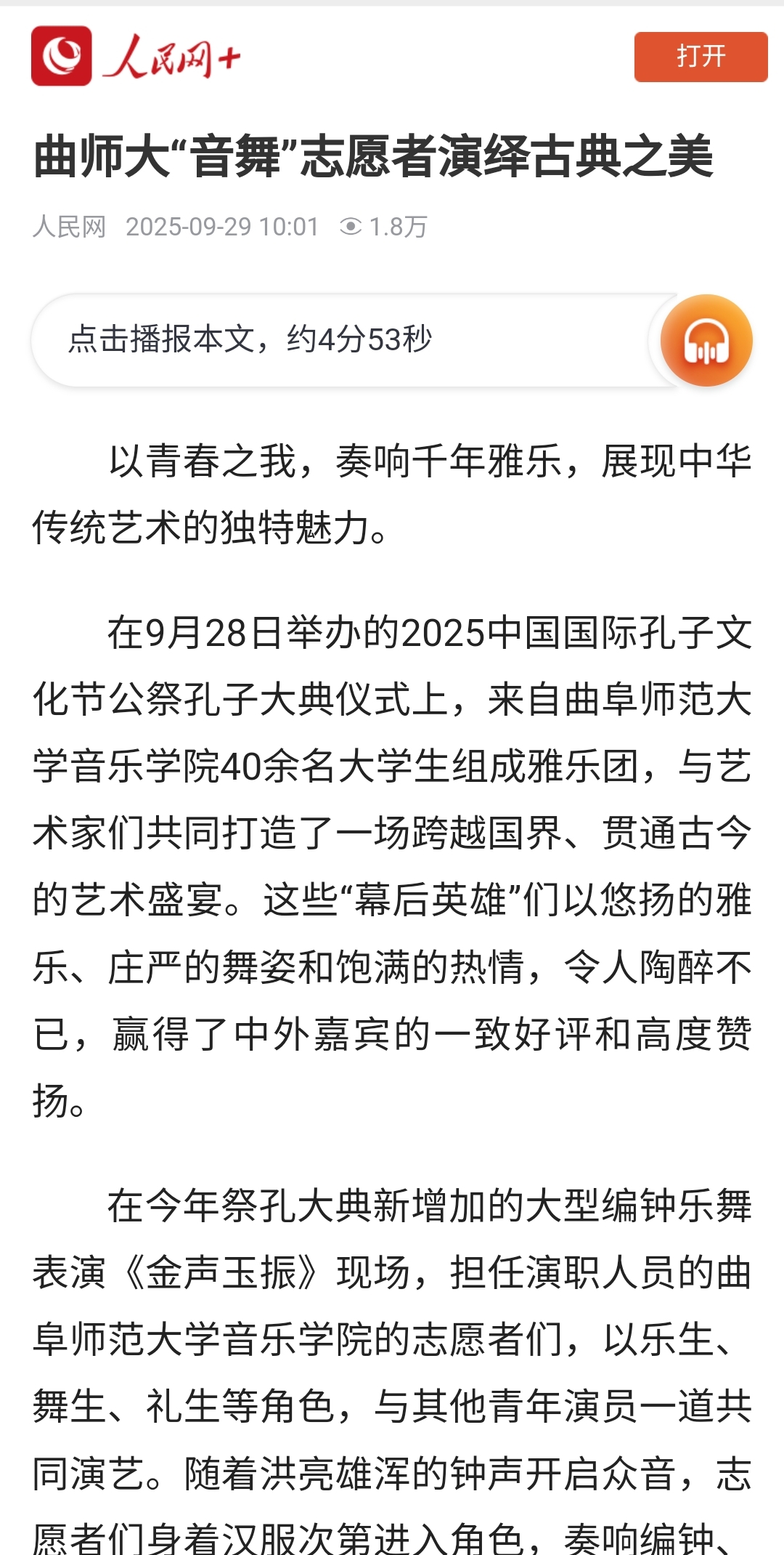 据了解,2025中国国际孔子文化节由山东省人民政府、文化和旅游部、中国联合国教科文组织全国委员会联合主办,举办地为山东省济宁市曲阜市,自1984年以“孔子诞辰故里游”为起点,历经40多年的传承发展,已成为享誉全球、跨越国界的文化盛典。大发平台音乐学院选派志愿者参加孔子文化节乐舞有关活动,这还尚属首次。