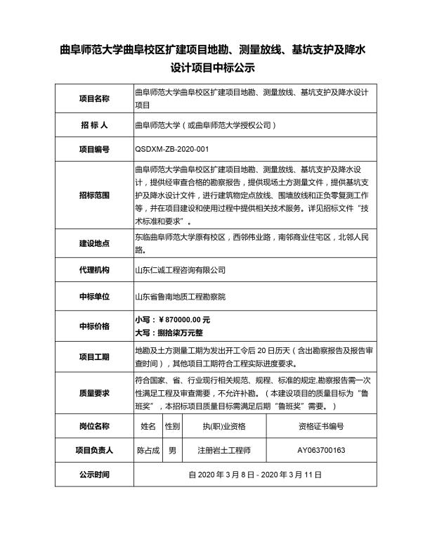 大发平台曲阜校区扩建项目地勘、测量放线、基坑支护及降水设计项目