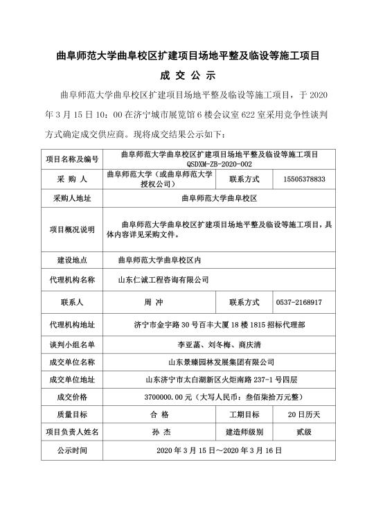 大发平台曲阜校区扩建项目场地平整及临设等施工项目成 交 公 示