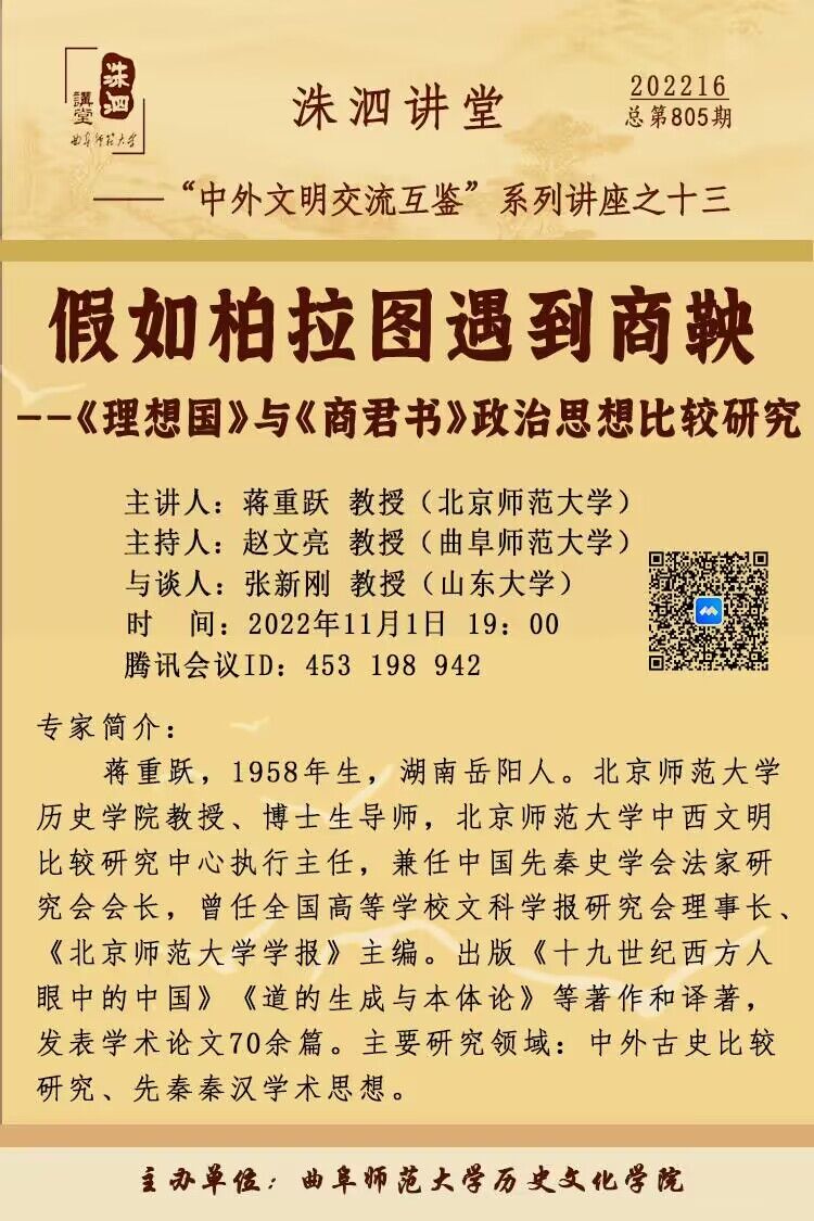 洙泗讲堂预告| 蒋重跃:《假如柏拉图遇到商鞅——〈理想国〉与-〈商君书〉政治思想比较研究》