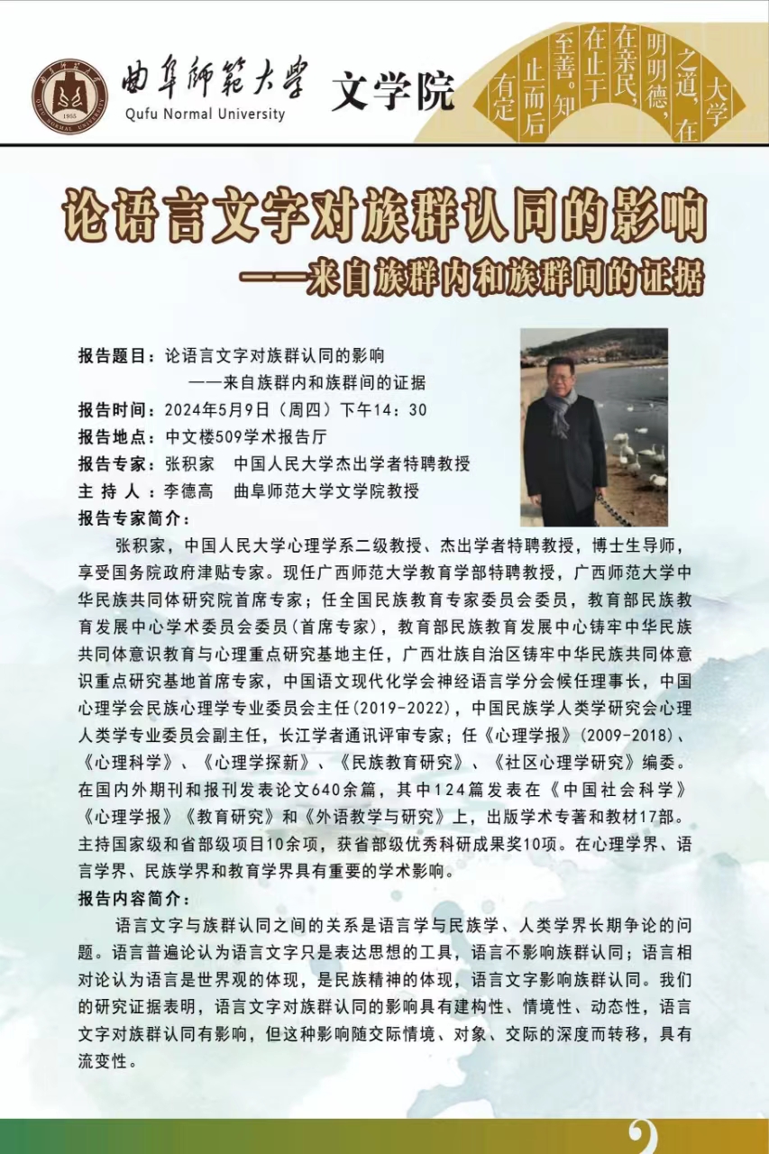 文学院学术报告预告:论语言文字对族群认同的影响