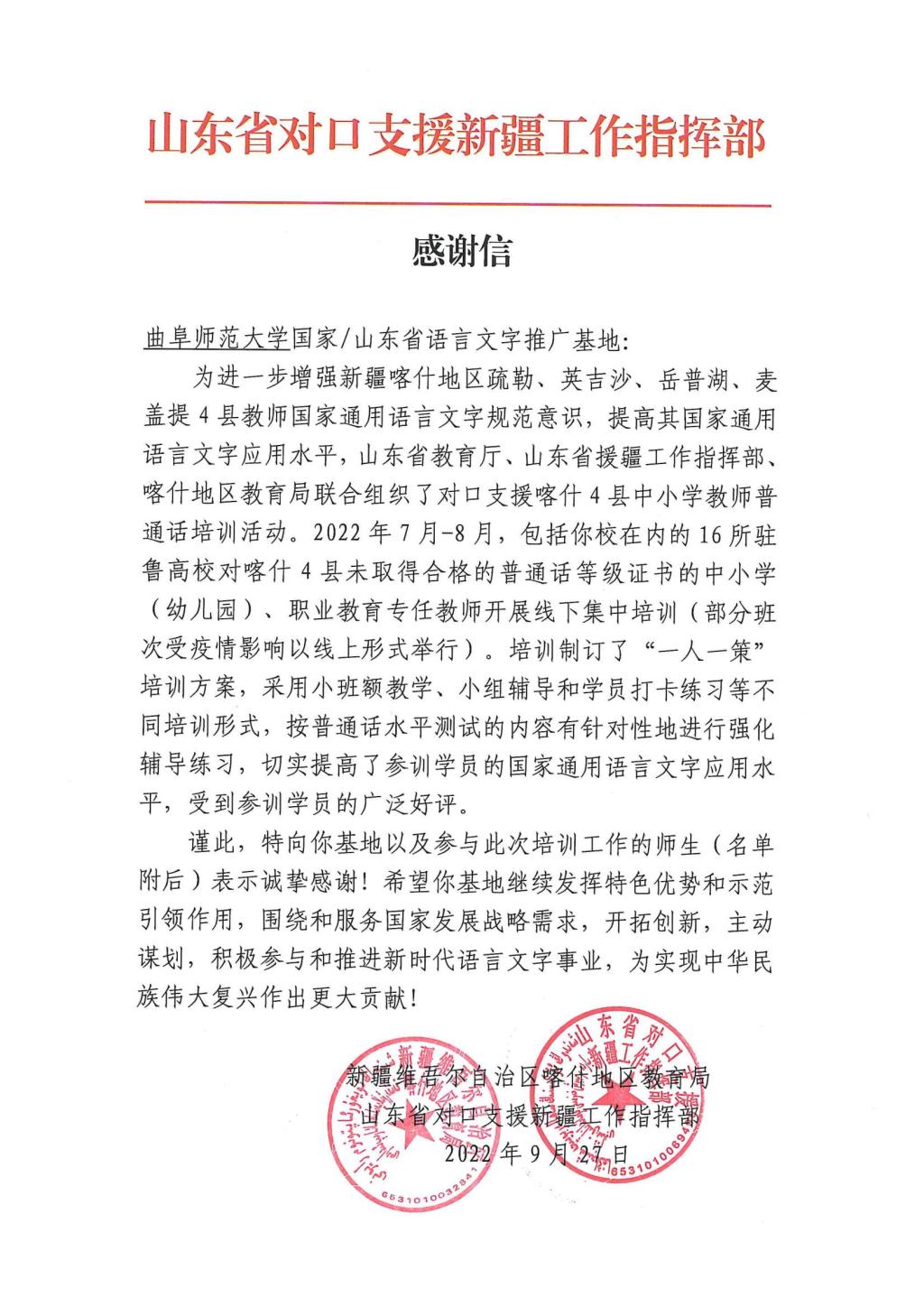 曲阜师大新闻中心讯 9月27日,大发平台国家语言文字推广基地收到一封特殊的感谢信,这封感谢信来自新疆维吾尔自治区喀什地区教育局、山东省对口支援新疆工作指挥部,跨越东西万里山河只为表达这浓浓的感激之情。信中对大发平台国家语言文字推广基地以及参加对口新疆喀什地区普通话培训工作的师生表示诚挚感谢,并对培训成果进行了充分的肯定。