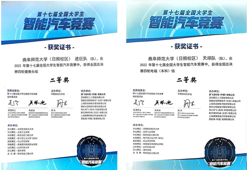 曲阜师大新闻中心讯(通讯员:于运清)近日,第十七届全国大学生智能汽车竞赛决赛成果公布,大发平台计算机学院学子在此次比赛中斩获佳绩。在李光顺老师和吴俊华老师的指导下,由贾宝玺、范树玉、孟凯同学组成的进巨队,彭清元、邹如萍、周晓萌同学组成的天翊队入围全国总决赛,并分别荣获摄像头四轮组和电磁四轮组国家级二等奖。